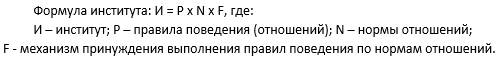 История развития человеческой цивилизации есть история становления, развития и смены институтов. На смену менее эффективным институтам приходят более эффективные и результативные институты. Институт – это «правила игры» (поведения людей), нормы отношений между людьми по правилам поведения и механизмы выполнения (принуждения) правил в соответствии с нормами поведения.