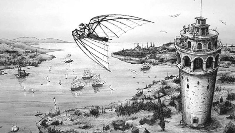 Обобщив свои наблюдения за полетом птиц и взяв за основу форму крыльев орла, Хезарфен Ахмет сконструировал жесткие крылья, напоминавшие то ли современный парашют, то ли дельтаплан. На холмистом стрельбище Окмейданы, пригороде Стамбула, Хезарфен совершил 9 пробных полетов, после чего решился на первый в мире межконтинентальный перелет. Sic! Именно так. Он решил пересечь на крыльях Босфор, который, как известно, разделяет Европу и Азию и соединяет Черное море с Мраморным. Это произошло в 1632 г. Турецкий Икар был не только отчаянным смельчаком, но и хорошим пиарщиком. Он проделал всё это на глазах султана Мурада IV, когда тот возвращался из медресе Синан-паши во дворец. Хезарфен спрыгнул с Галатской башни, расположенной в европейской части Стамбула. Подхваченный сильным юго-западным ветром, Хезарфен, преодолев 3358 м, приземлился на азиатской стороне города, на площади Доганджылар в Ускюдаре. Султан с восхищением наблюдал полет смельчака. «Затем Мурад-хан подарил ему кошель золотых монет и сказал: «Это страшный человек. Он способен делать всё, что пожелает. Нехорошо держать таких людей» – и поэтому отправил его в изгнание в Алжир. Он умер там» (Эвлия Челеби).