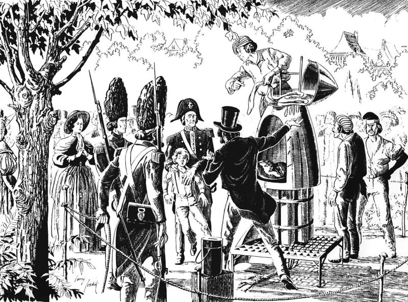 «В 1830 г. Руджиери объявил, что он будет использовать большое количество ракет, чтобы поднять в воздух более крупное животное, барана, в воздух. Молодой человек (возможно, всего 11 лет), по-видимому, предложил заменить барана в качестве пассажира. Его собирались поднять с Марсова поля. Однако вмешались французские власти и отменили полет, по-видимому, из-за молодости волонтера» (Википедия).