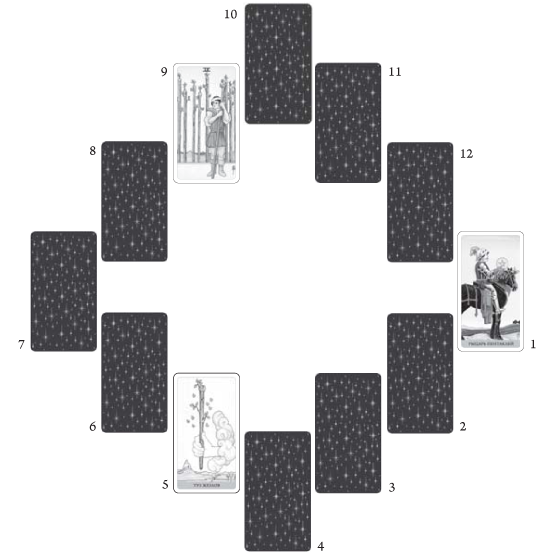 Король Кубков – шестерка Кубков: «Погоня за наслаждениями приводит Вопрошающего…» Пятерка Пентаклей: «…к денежным потерям и неудачам в делах». Отшельник: «В результате он вынужден проявлять большее благоразумие…» Четверка Кубков: «…и ограничить светское общение, которое и так уже доставило ему неприятности».