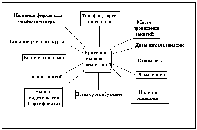 Конечно, осветить все, выше приведенные критерии в рамках одного объявления в газете, практически невозможно. Но, при решении вопросов обучения, есть критерии, ответ на которые вы должны получить или уточнить (например, по телефону) обязательно. На рисунке 1.6 они выделены жирным шрифтом. В случае если выясняется, что хотя бы один из этих критериев отсутствует, с такой организацией, проводящей обучение, связываться явно не стоит.