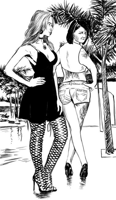 Вторая была моложе, светлолицая, тоже жгучая брюнетка, по формам уступавшая первой примерно вполовину. Цветастый топик был настолько невесом и так плотно облегал её естество, что казался нарисованным на теле; а бриджи просто сливались с южным загаром. И если бы не полузакрытые татуировки в виде бабочки на левом плече и в виде дракона на правом бедре, и рельефно выступающие контуры нижнего белья, то можно было подумать…