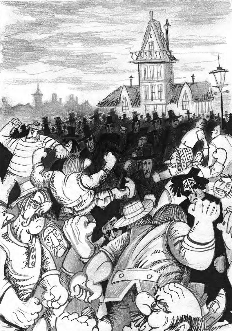 – Рано радуетесь! – сказал Мистер Мрак. Он хлопнул в ладоши – и люди увидели уже две черные фигуры. Они снова хлопнули, и фигур оказалось четыре, потом восемь, потом шестнадцать… Через несколько минут большая толпа черных фигур стала наступать на бунтарей. Завязалась схватка. Горожане дрались отчаянно, но темные силы их начали одолевать.