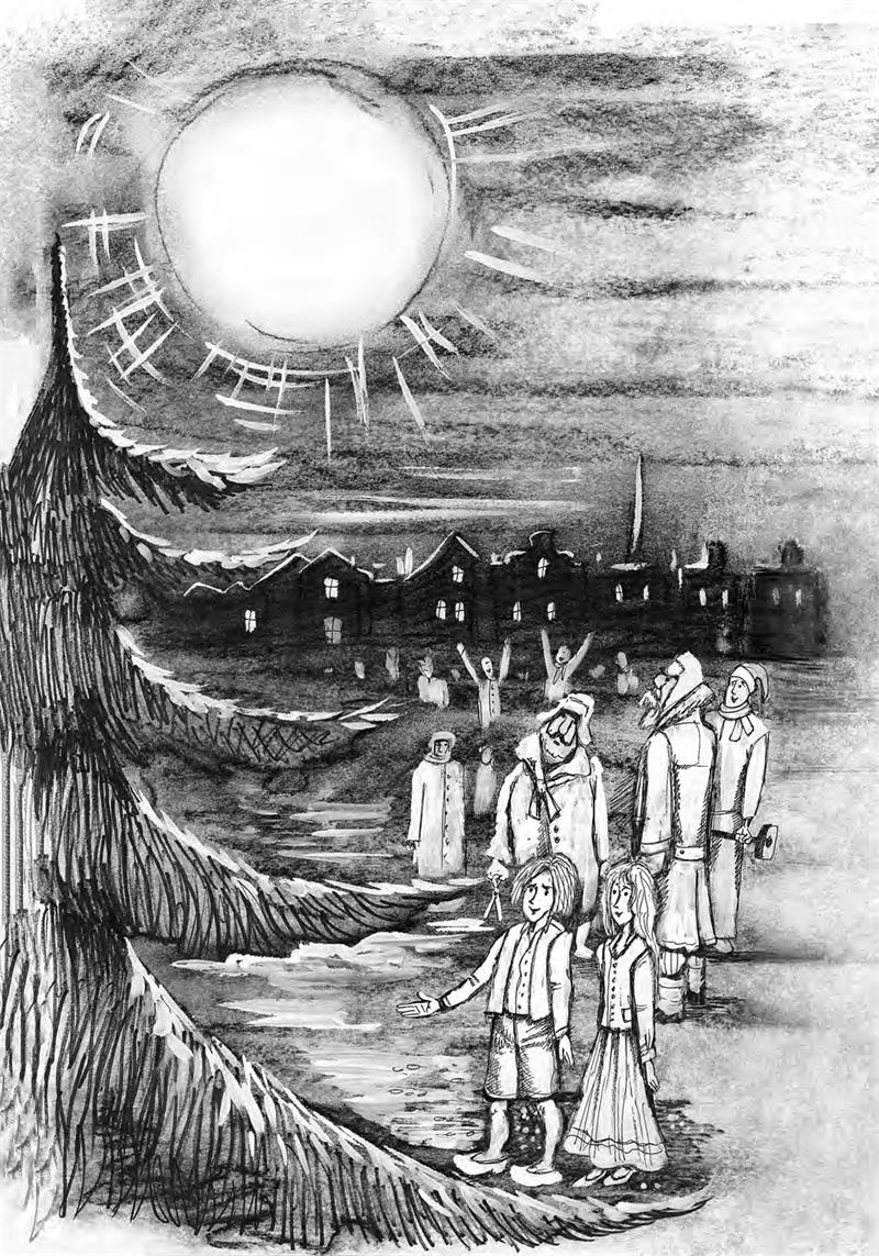 Он сильно похудел, на его бровях застыл иней, одежда превратилась в лохмотья. Игрушечник держался прямо, с большим достоинством, и дети не сразу заметили, что на его руках были кандалы.