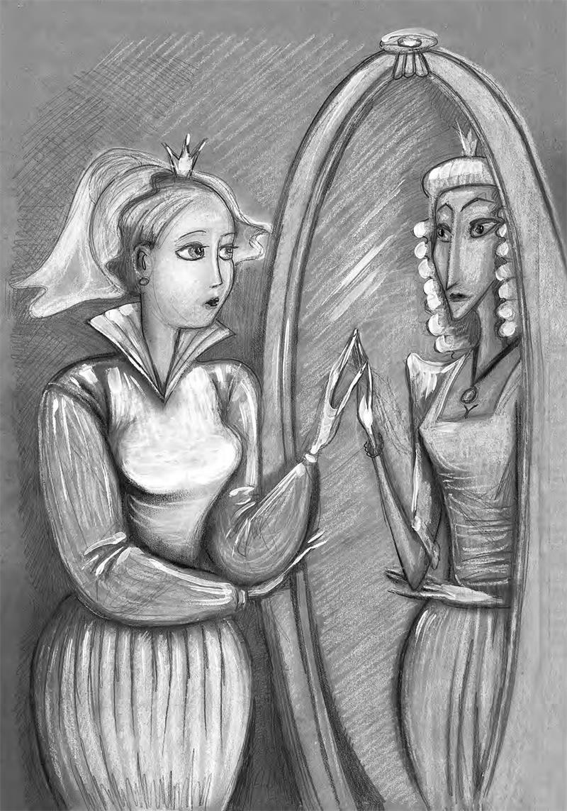 Королевство слыло образцовым, но это почему-то не радовало Зеркальную королеву. Она не любила своих подданных и могла придраться к каждому пустяку. А придираться королева умела. За каждую неаккуратность, невежливость или просто смятение жестоко наказывала. Поэтому жители старались как можно реже попадаться ей на глаза. А вот придворные придумали уловку, которая спасала им жизнь и карьеру. Они заказали портным шить зеркальные платья и плащи. Как только королева направляла на них свой гнев, они расправляли свою зеркальную одежду. Разгневанная королева видела свое злое отображение и, разумеется, приходилось смягчаться. Через некоторое время в замке, кроме королевы, не осталось ни одного лица, и она часто скучала.