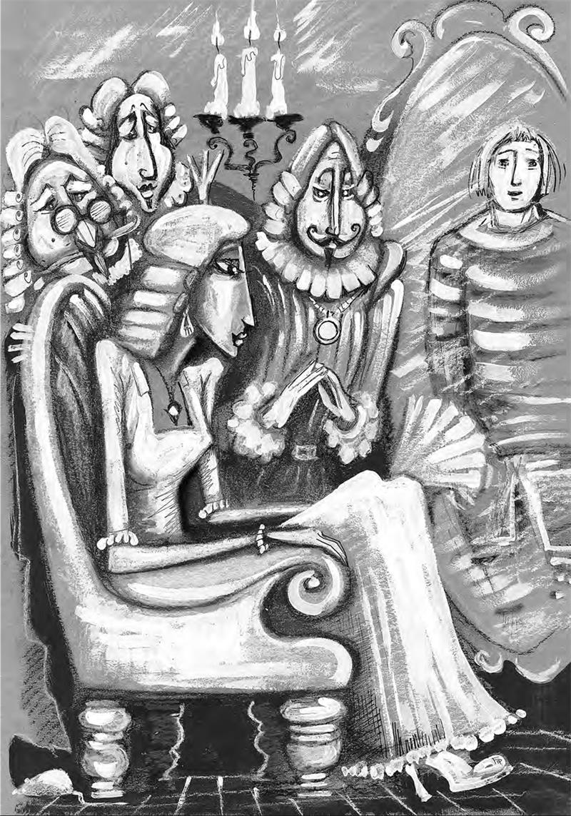 * * *В это время Зеркальная королева сидела в окружении своих фаворитов. Это были барон Гламур, герцог Кич-Китч, и граф Каприз. Одетые с иголочки и напомаженные, словно картины, фавориты изнывали от скуки и не знали, как развлечь свою королеву. В это время в тронный зал влетел Гонец: