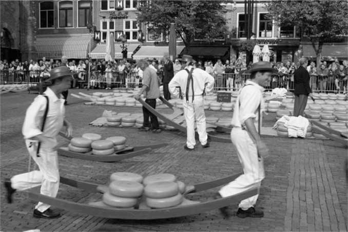 Ярмарка начинается в 10 утра и длится всего 2–3 часа, за которые перед глазами зрителей (они же участники) разворачивается увлекательное действо с непременными персонажами: весовщиками, одетыми в традиционные строгие черные костюмы, контролёрами качества сыров в белых халатах, а также четырьмя корпорациями носильщиков, одетыми, согласно правилам гильдии, также в белоснежные одежды, но отличающимися друг от друга по цвету шляп. Перекинув крест-накрест ремни со специальными креплениями и подцепив на них носилки с сырами, мчатся на весовую носильщики, чтобы взвесить свой деликатесный груз. А когда какой-нибудь энергичный зритель, введенный в заблуждение той легкостью, с которой двигаются носильщики, просится подменить кого-нибудь из них, то можно наблюдать, как подкашиваются ноги энтузиаста, пытающегося маневрировать со 150-килограммовой тележкой.