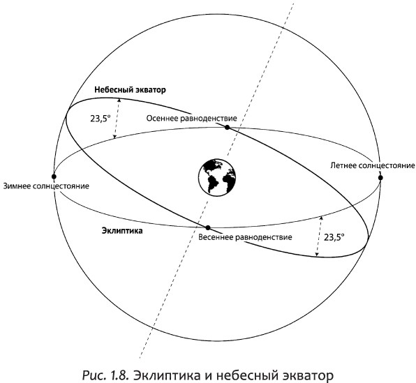 На рис. 1.8 вы видите взаимное расположение эклиптики и небесного экватора. Между ними угол около 23,5° – это угол, под которым ось Земли наклонена к плоскости ее орбиты вокруг Солнца.
