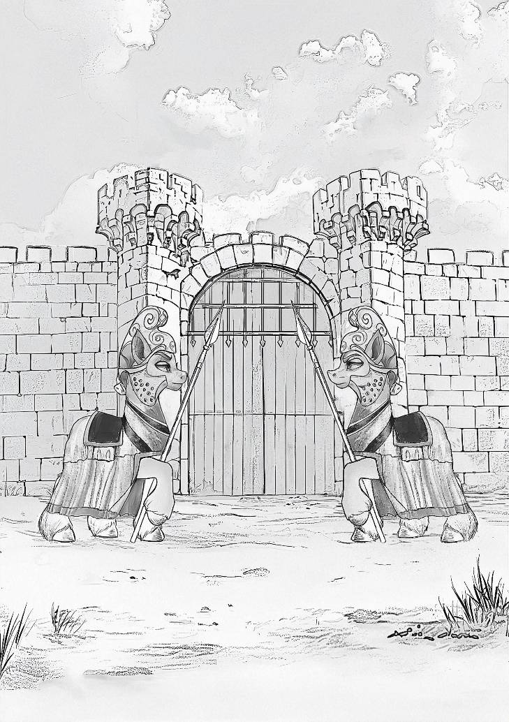 У ворот его встретили двое коней в доспехах из простеганной ткани и железных шлемах с гребнями. Копытами держали копья, одновременно опираясь на них.