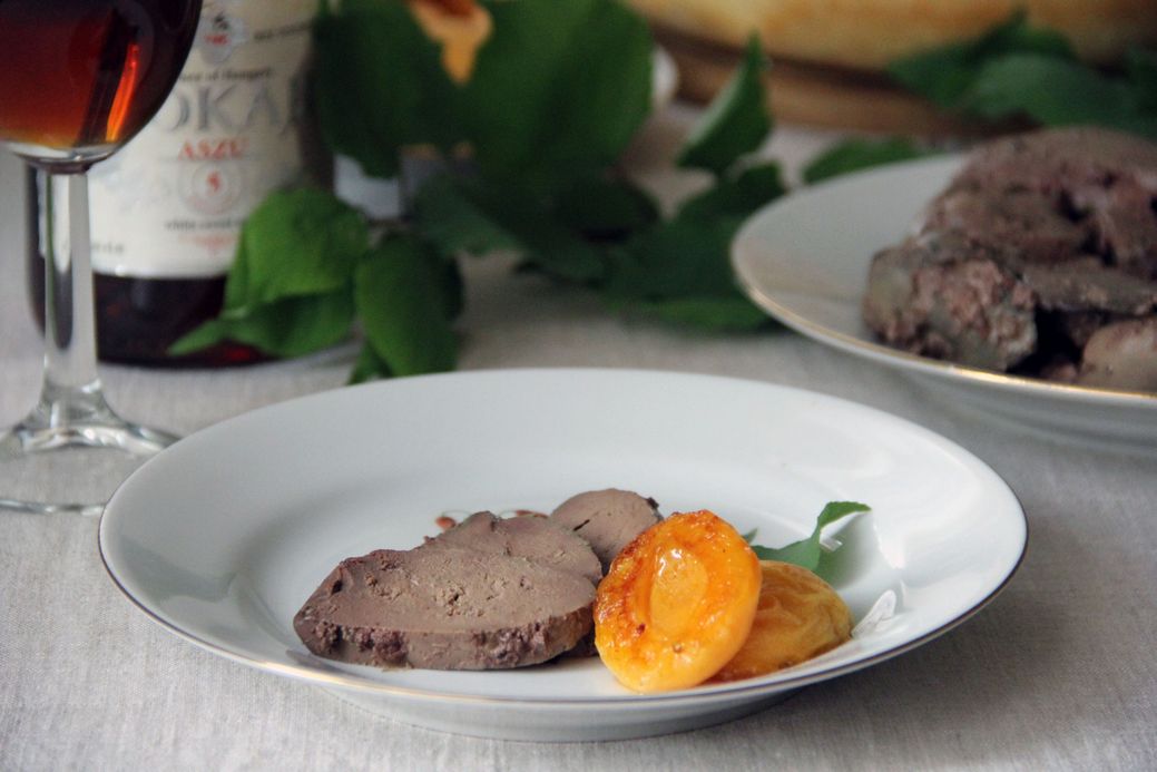 Перед подачей на стол извлечь печёнку из горшка и нарезать её тонкими ломтиками. Подавать с жареными на топлёном масле абрикосами и вином, которое использовали при приготовлении.