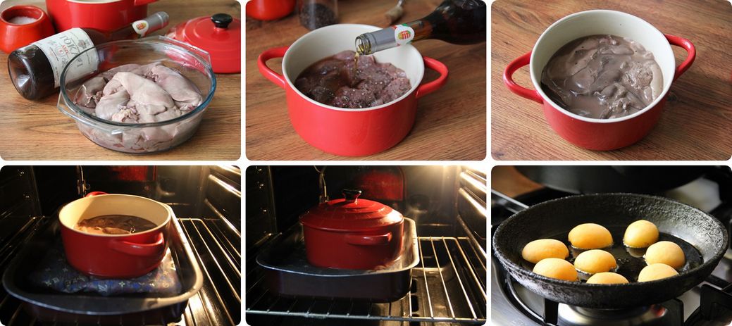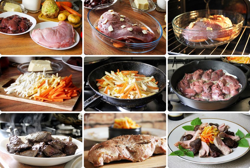 Мясо и печень должны быть розового цвета. В качестве соуса использовать сок от жаркого.