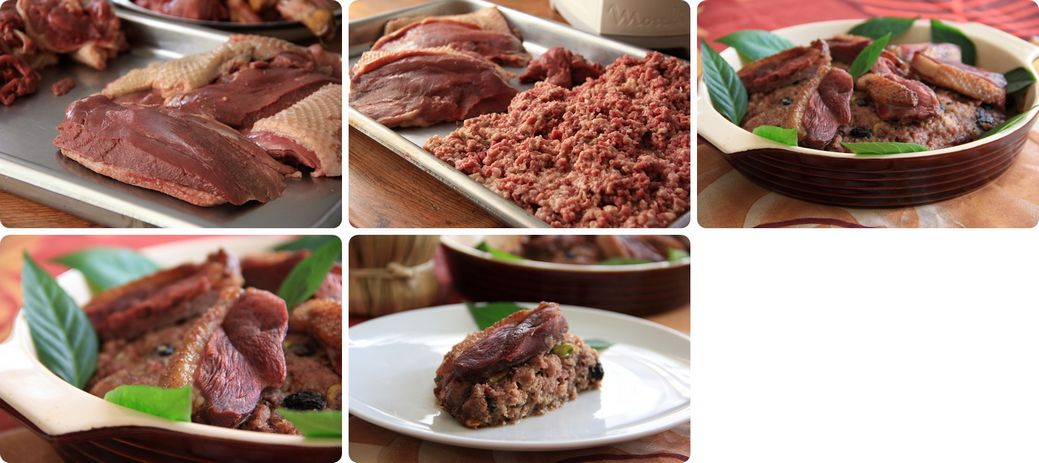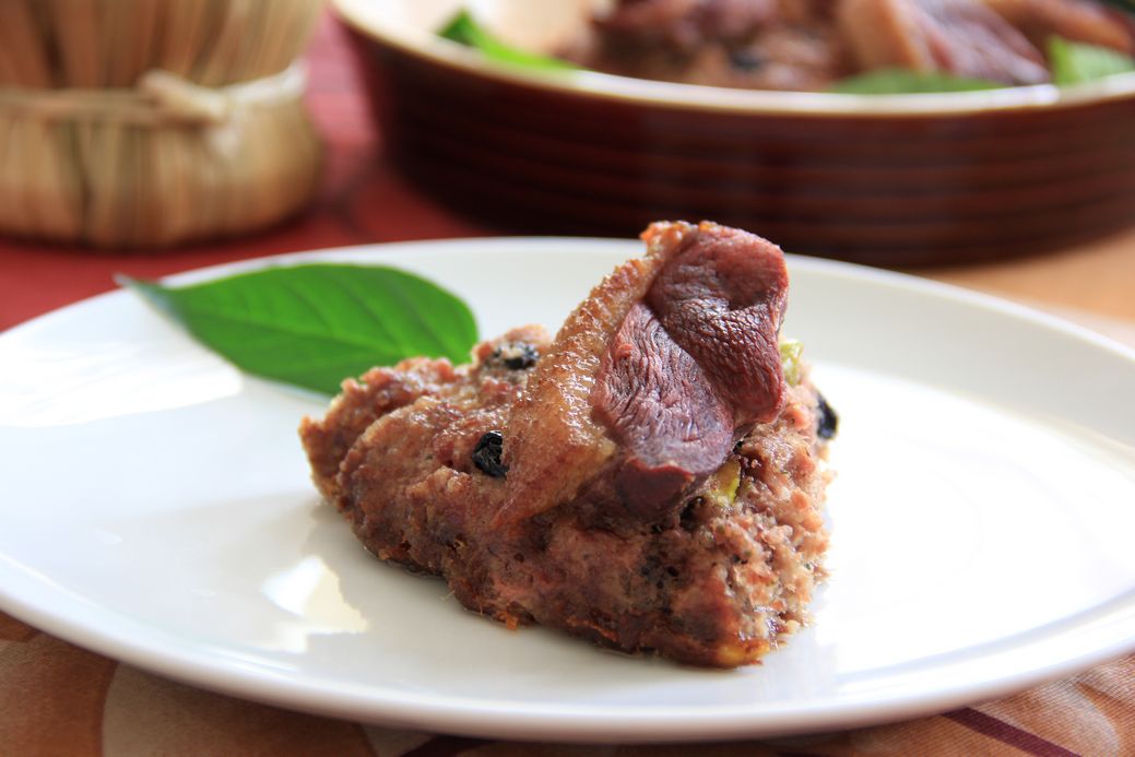В фарш из мяса гуся добавить вымытый и обсушенный изюм, очищенные фисташки, шалфей, натёртую цедру лимона, приправить солью и перцем. Ввести яичные белки, перемешать. Добавить панировочные сухари, хорошо перемешать, в конце влить красное сухое вино и ещё раз всё тщательно перемешать. Выложить полученную массу в жаропрочную форму ровным слоем. Сверху разложить гусиную грудку, нарезанную ломтиками толщиной 1-1,5 см, посолить, поперчить, полить соком лимона.