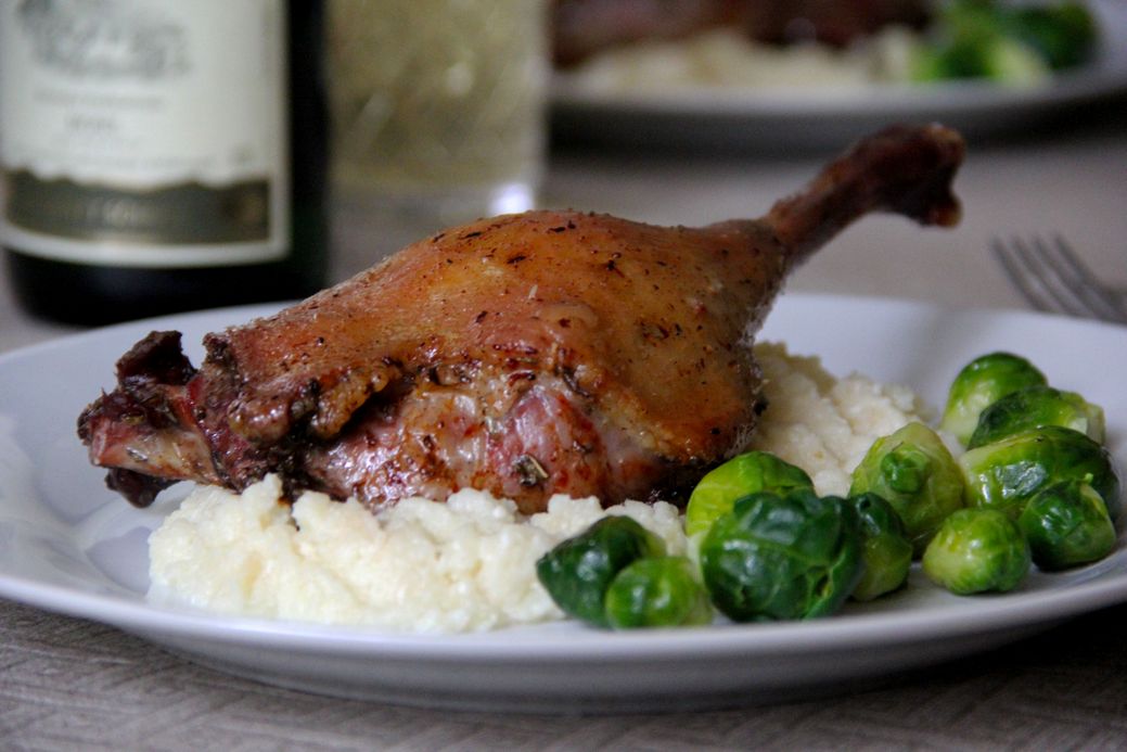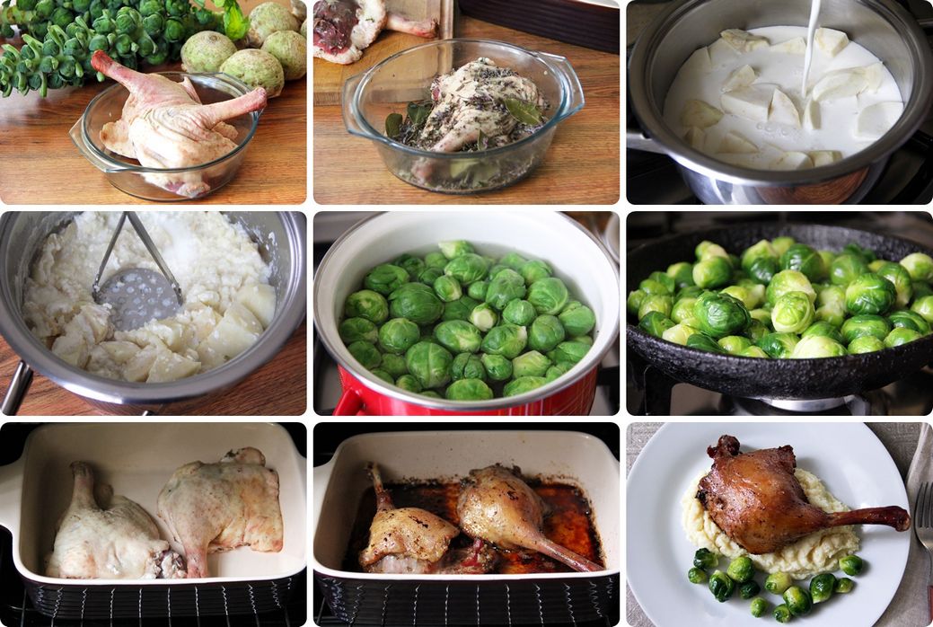 Печёная ножка гуся с пюре из сельдерея и брюссельской капустой