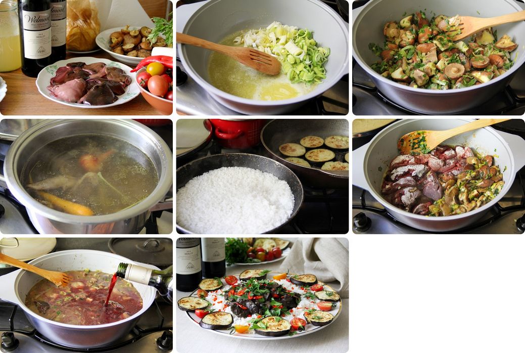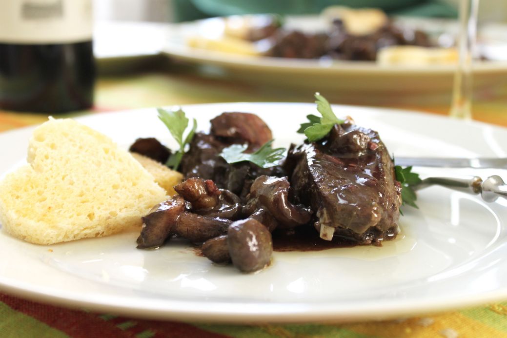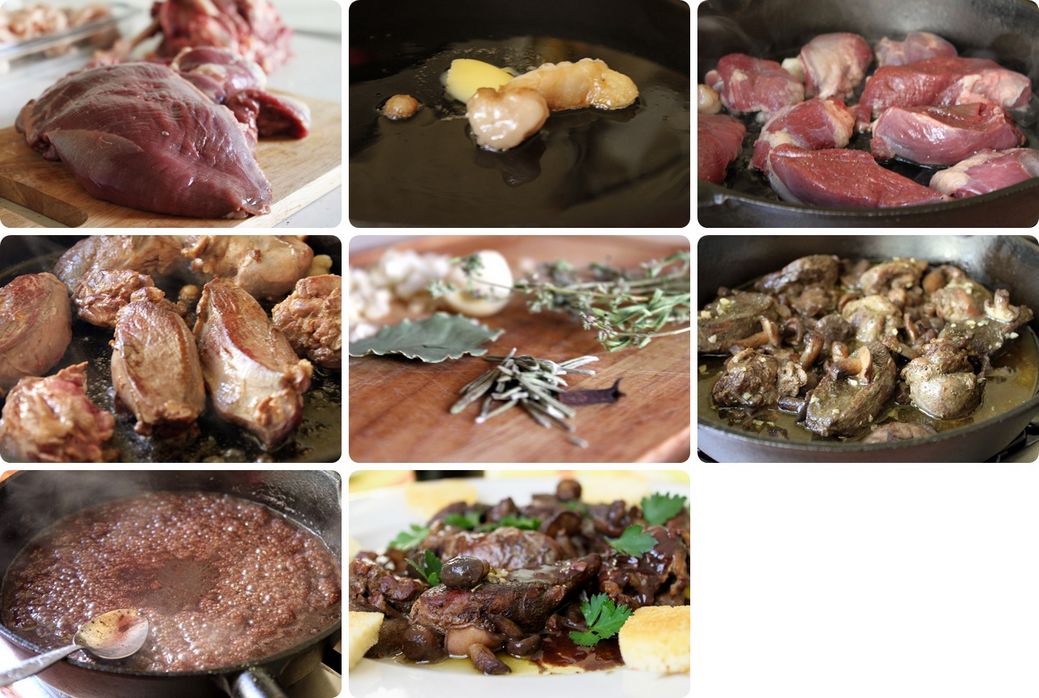 Печень индейки очистить от плёнок и жилок, разделить на две части, обвалять в муке, смешанной с солью и перцем. Положить печень в сковороду к грибам. Обжарить с двух сторон не более 5 минут. Влить бульон и красное вино, подержать на огне минут десять (количество жидкости должно уменьшиться).