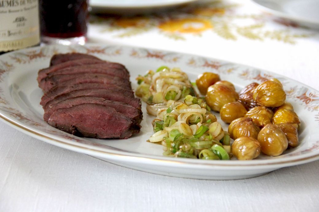 Гусиную грудку нарезать по диагонали на ломтики и выложить на сервировочное блюдо, положить карамелизированные лук-порей и каштаны.