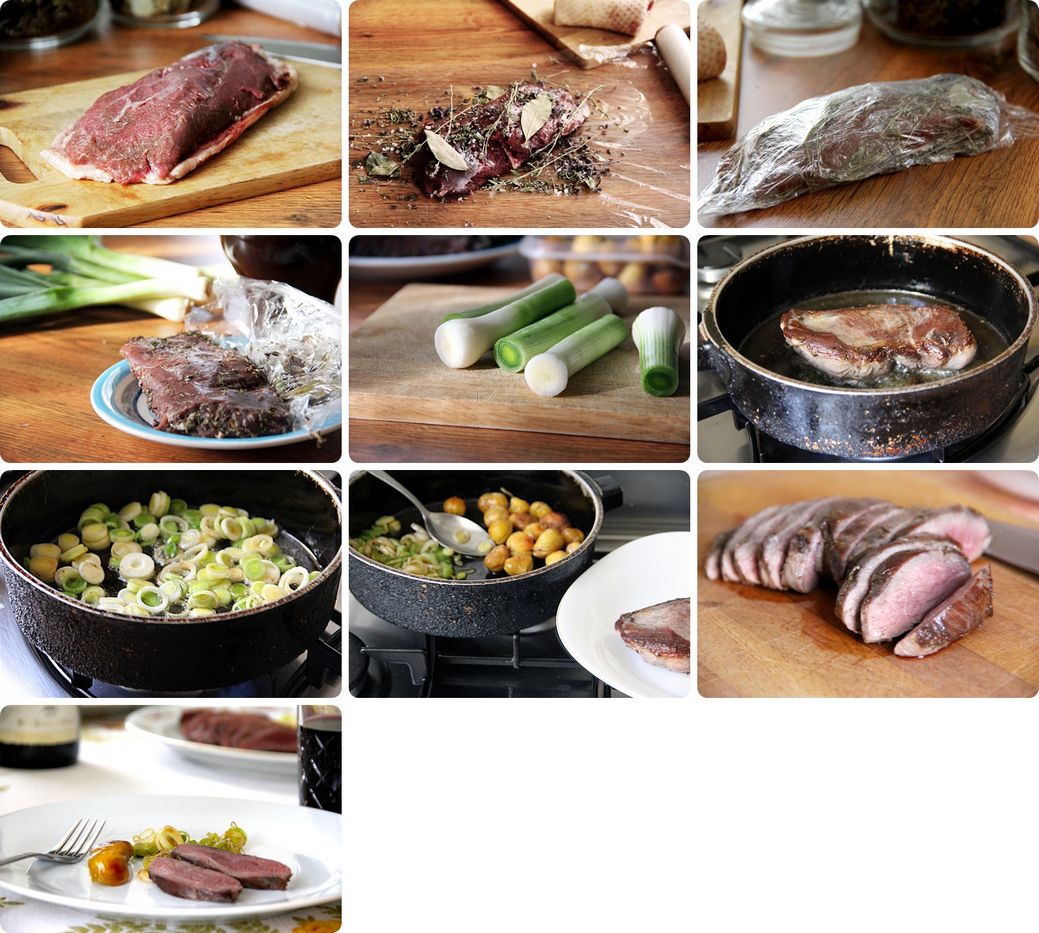 Достать грудку, очистить от специй и обжарить на смеси сливочного и оливкового масел по 2 минуты с каждой стороны. Переложить на тёплую тарелку. В сковороду, где жарилось мясо добавить лук-порей и обжаривать его 2 минуты (до мягкости), затем добавить печёные каштаны и мёд, держать на огне ещё 1-2 минуты.