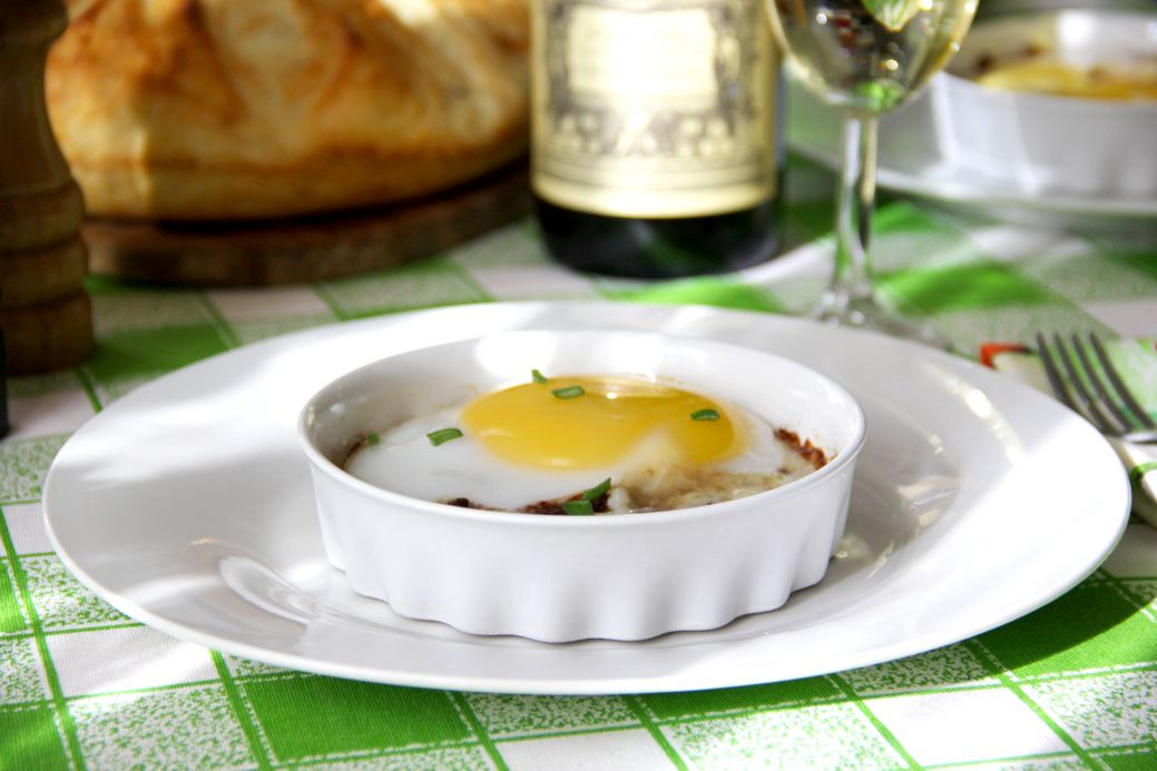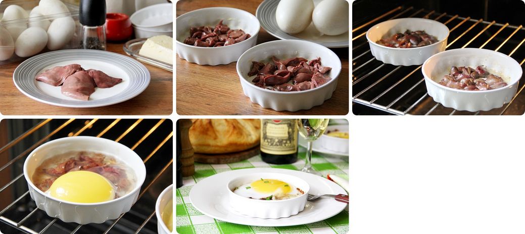 В каждую форму вылить по одному яйцу и снова поставить в духовку. Запекать приблизительно 5 минут. Подавать на стол сразу же. При подаче посолить и поперчить по вкусу, посыпать нарезанным зелёным луком.
