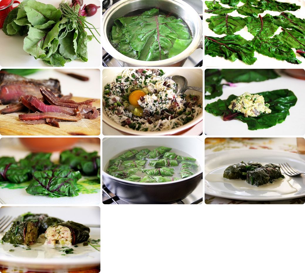 На край каждого листа мангольда положить по 1 ст.л. начинки и завернуть таким образом, чтобы начинка оставалась внутри листа. Дно широкой кастрюли смазать маслом и вкруговую в один слой выложить голубцы. Залить горячим бульоном, накрыть перевернутой тарелкой (чтобы не открылись) и тушить, не давая кипеть, примерно 25-30 минут.