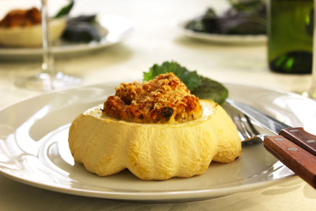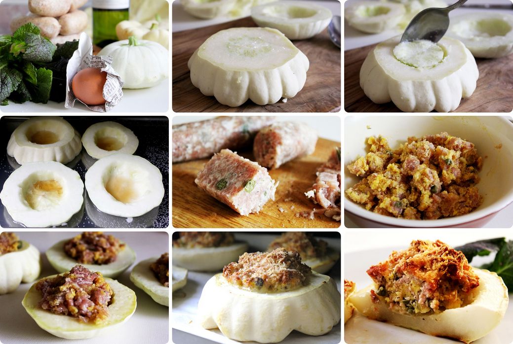 Тем временем смешать колбасу, сухари и яйцо в миске. Вынуть патиссоны из духовки и наполнить каждую половину одной четвертью колбасной начинки. Посыпать пармезаном. Поставить патиссоны обратно в духовку и запекать еще приблизительно 40 – 45 минут. Подавать горячими.
