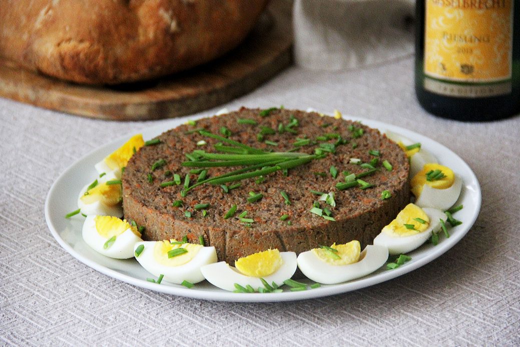 Поставить паштет в разогретую до 200°С духовку на 25 минут. Затем накрыть паштет фольгой и продолжить запекание в течение 20 минут, после этого снять фольгу и подсушить паштет 3-5 минут, до образования румяной корочки.