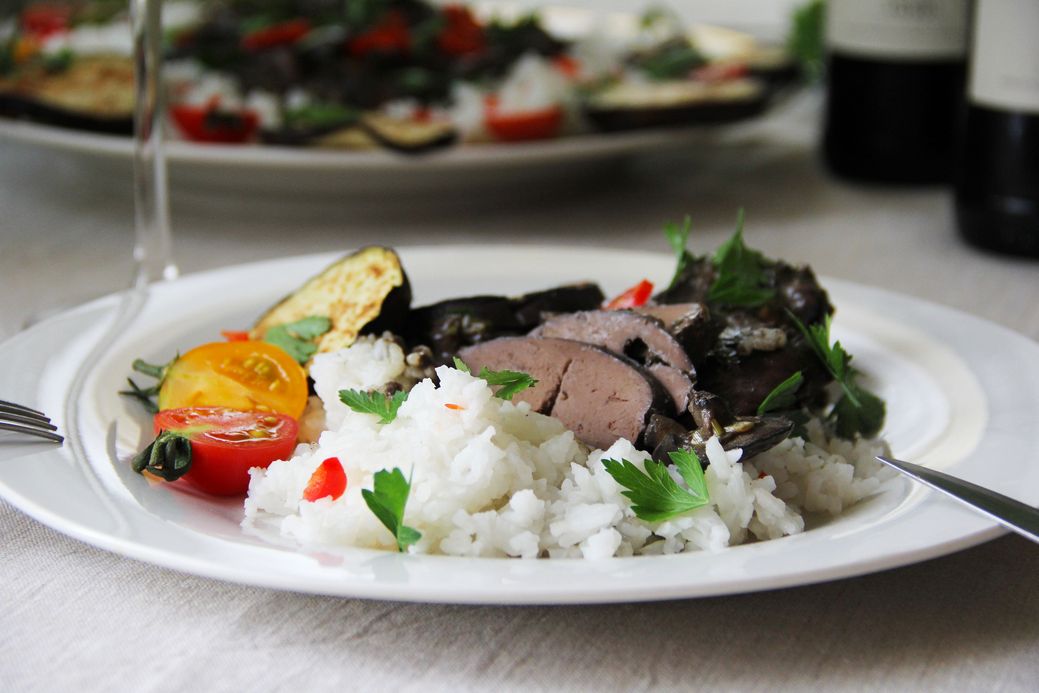 для гарнира: отварной рис, печёные или жареные баклажаны, свежие томаты, красный сладко-острый перец