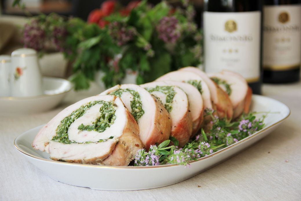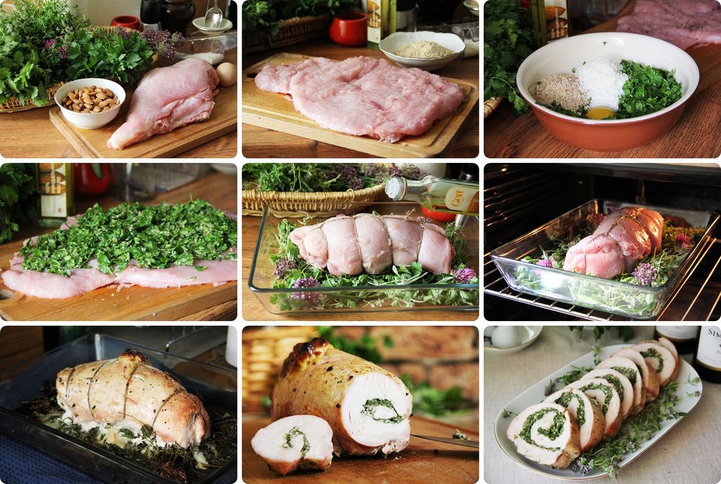 Рулет из грудки молодой индейки с весенними травами и миндалём