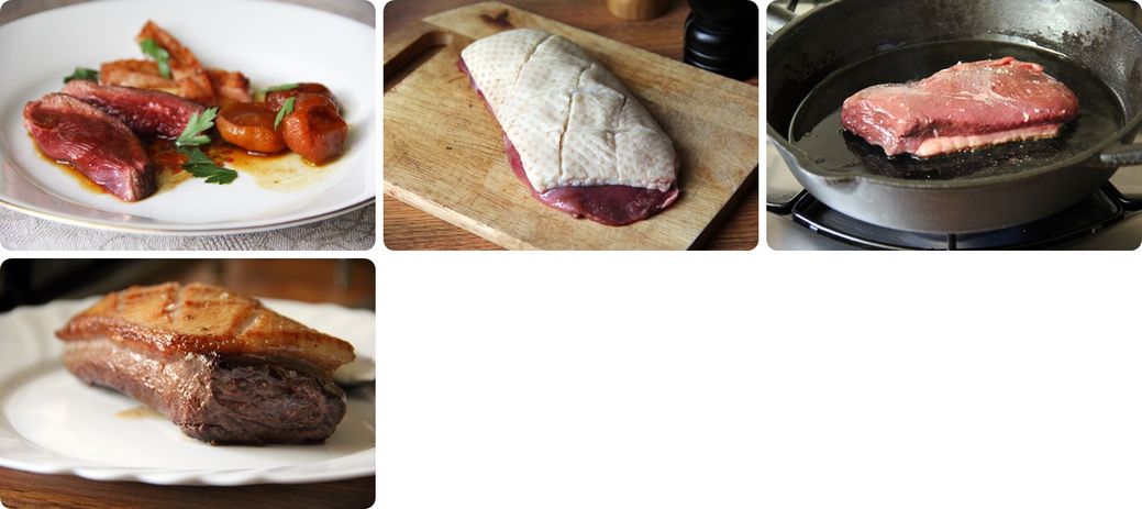 Срезать с гусиной грудки сухожилие, подравнять неровные края, кожу надрезать крест-накрест, чтобы во время жарки вытапливался жир. Посолить, поперчить, обжарить на раскалённом топлёном масле с двух сторон по 4-5 минут. Боковые стороны жарить по 2 минуты. Снять с плиты, дать постоять 2-3 минуты.