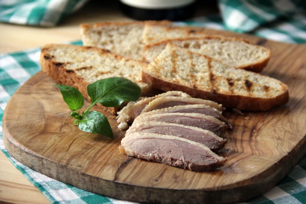 Для подачи на стол достать гусиное мясо, очистить от жира, нарезать наискосок очень тонкими ломтиками и разложить, перекрывая один другим, на подходящей тарелке или блюде. Украсить несколькими листочками салатных овощей и подавать вместе с обжаренным горячим белым или чёрным хлебом.