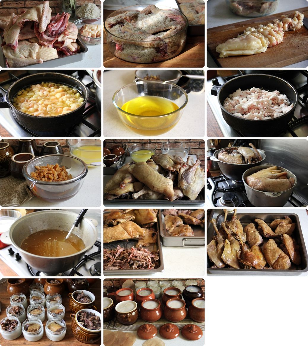 Извлечь куски гуся из соли, потрясти их и тщательно обтереть. Положить в посудину с тёплым расплавленным гусиным жиром. Медленно нагревать, чтобы жир едва кипел. Чтобы получить продукт самого высокого качества, нужно примерно 2 часа.