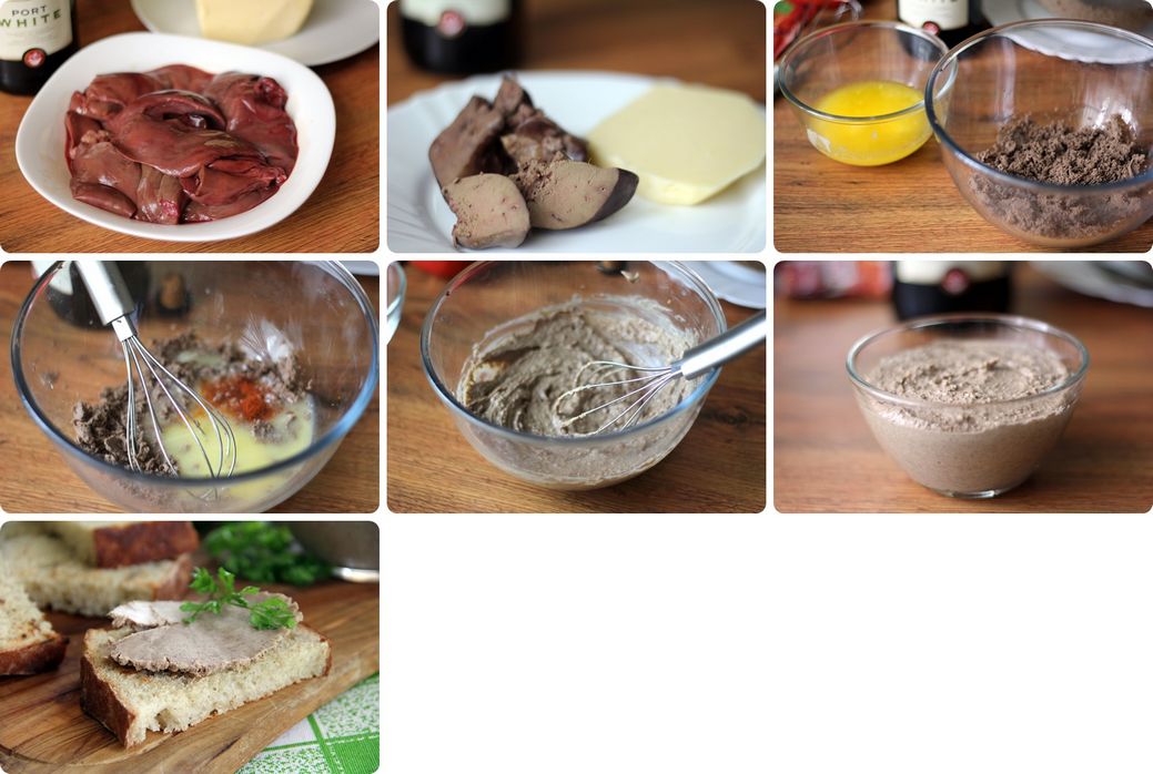 Протереть через мелкое сито варёную гусиную печёнку. Растопить сливочное масло, слегка взбить его и пока оно ещё тёплое смешать с пюре из гусиной печёнки. Влить портвейн, посолить, поперчить и тщательно перемешать.
