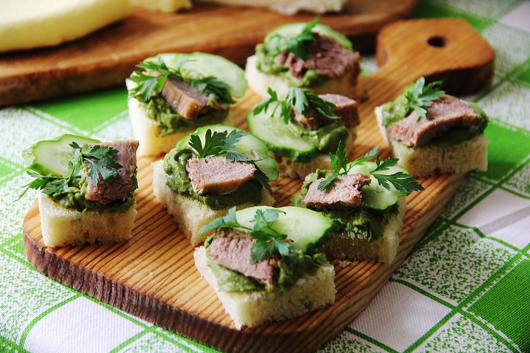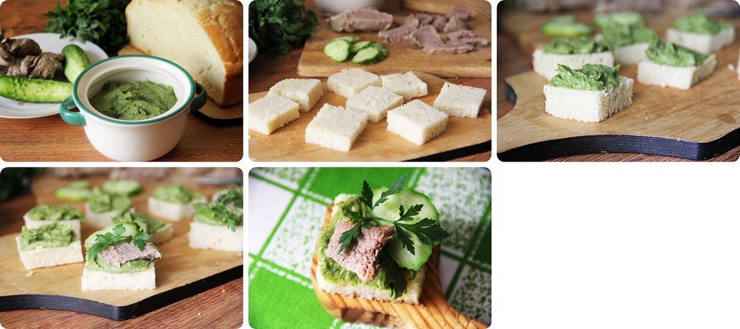 Кусочки хлеба незадолго до подачи к столу намазать холодным соусом-кремом из мангольда (см. Доп. рецепты), положить на каждую тартинку кусочек отварной индейки и тонкий ломтик свежего огурца, украсить петрушкой.