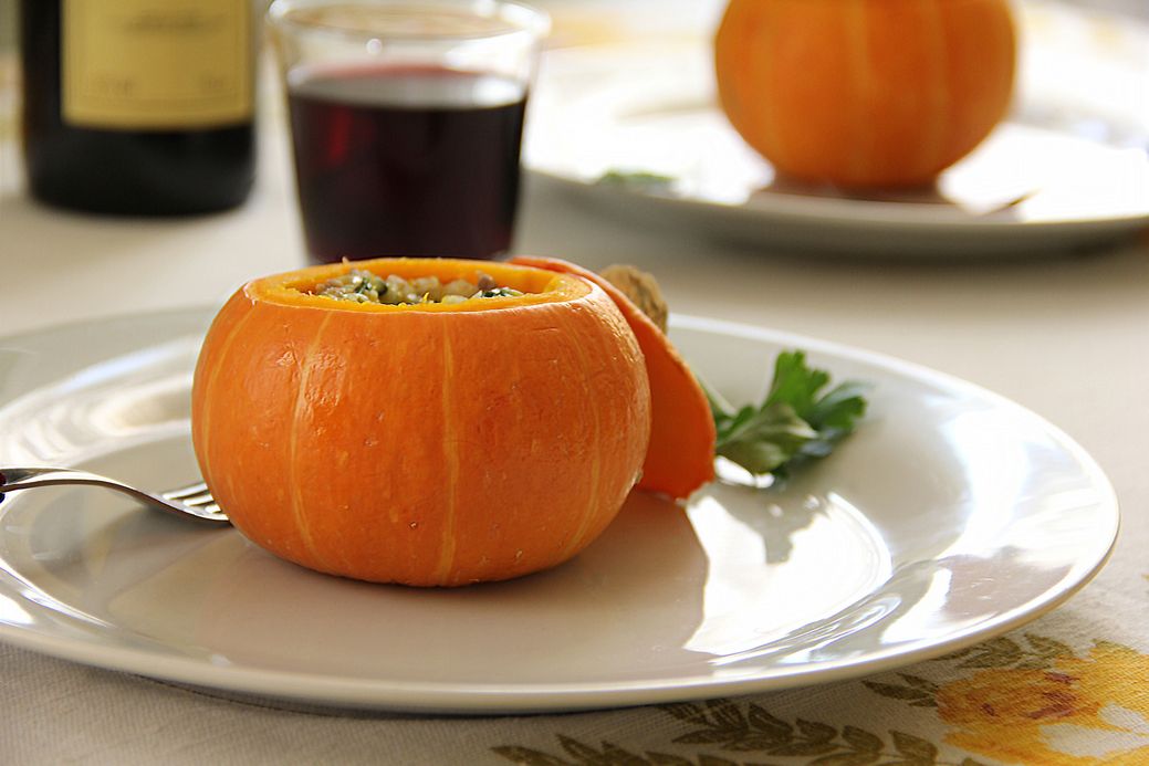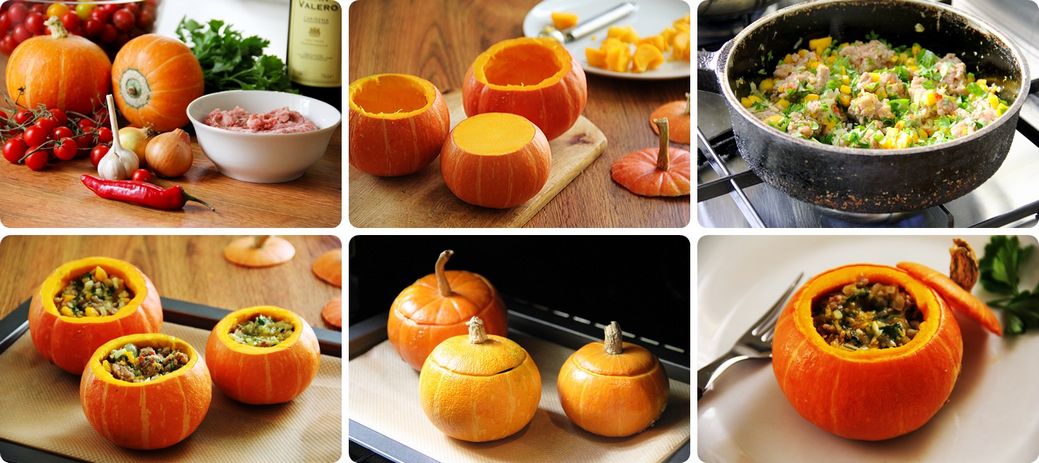 Срезать верхнюю часть (крышечки) с тыквы. Ложкой вынуть мякоть, оставив стенки толщиной 1 см. Мякоть очистить от семян и нарезать кубиками. Лук, чеснок, перец чили очистить и мелко нарезать. В сотейнике разогреть оливковое масло и обжарить лук и мякоть тыквы в течение 2-3 минут. Затем добавить фарш из индейки, перец чили, чеснок и петрушку, держать на среднем огне ещё 7-8 минут, время от времени перемешивая смесь. Посолить. Заполнить начинкой тыквы, накрыть крышечками и поставить в разогретую до 200°С на 30 минут.
