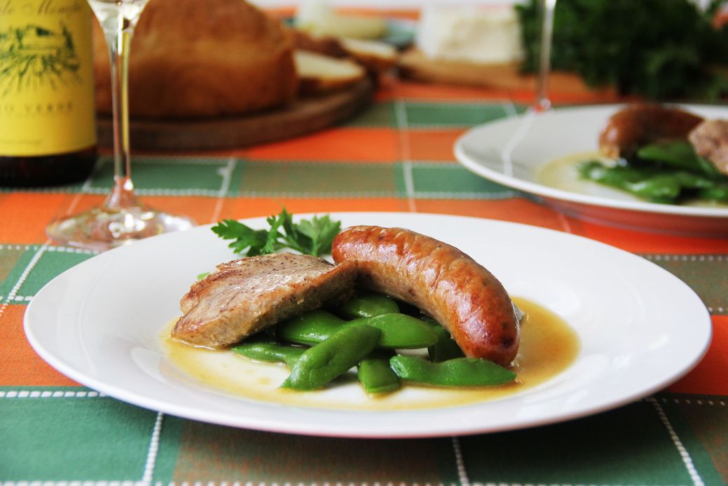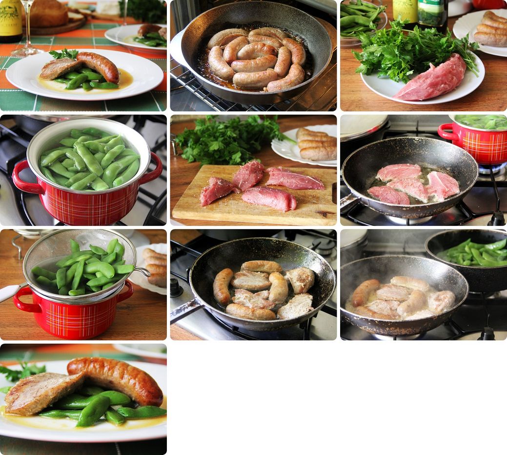 Филе индейки нарезать на порции, посолить и поперчить по вкусу, обжарить на оливковом масле (2 ст.л.) с обеих сторон до зарумянивания. Добавить печёную колбасу, влить вино и готовить 5 минут на среднем огне. Тем временем разогреть другую сковороду и обсушить в ней отварную фасоль в течение 1 мин., затем влить оставшееся оливковое масло, перемешать и снять с огня.