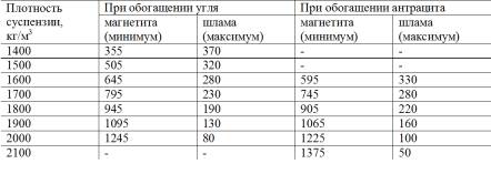Плотность магнетитовой суспензии выбирают в зависимости от свойства обогащаемого угля и целей обогащения.