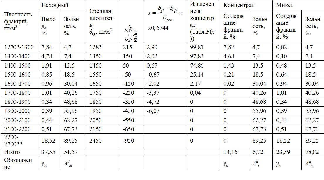 Для выполнения расчетов с помощью Еpm необходим подробный фракционный состав машинного класса (табл. 1.28). Извлечение факций в продукты обогащения определяют по табличным значениям функции Гаусса (табл. 1.29).