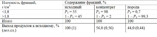 Принимая исходный за 1, выход концентрата γк=0,56 а породы γп=0,44.