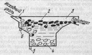 1 – загрузочная часть ванны; 2 – проточная часть ванны; 3 – разгрузочная часть ванны для легких фракций; 4 – разгрузочная часть ванны для тяжелых фракций; 5, 6 – подача вертикального и горизонтального потоков суспензии
