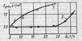 Рис. 2.2. Зависимость показателя эффективности разделения Еpm от производительности Q для ванны стандартной (1) и оптимизированной (2) форм