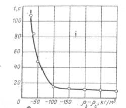 Рис. 2.3. Зависимость времени пребывания в ванне сепаратора легких зерен (крупность 100 мм) от разности плотностей зерен и суспензии δз-δс, кг/м3