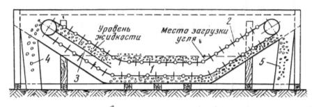Суспензия заливается в ванну так, чтобы она перекрывала верхний край скребков верхней части конвейера. Уголь загружается в начале горизонтального участка конвейера. Материал большей плотности, чем плотность суспензии, погружается и выносится из ванны нижней ветвью конвейера в желоб 5, а всплывший продукт выносится верхней ветвью.