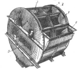 Сепаратор «Нельсон-Девис» (рис. 2.11) представляет собой цилиндрический кожух 1 диаметром 3 м и шириной 2,1 м. В кожухе заключен вращающийся барабан 2, разделенный на отсеки 4 лопастями 3 с отверстиями. Частота вращения барабана 2 об/мин.