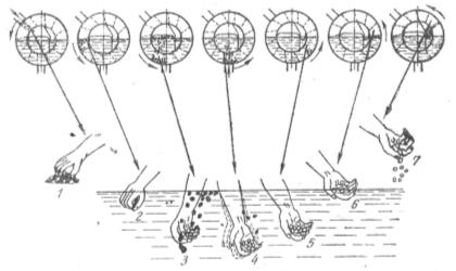 1 – захват угля рукой; 2 – погружение руки с углем в суспензию; 3 – всплывание угля при раскрытии погруженной руки в суспензии; 4 – потряхивание рукой для более полного отделения концентрата; 5, 6 и 7 – удаление из суспензии невсплывшего продукта