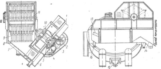 Сепаратор колесный с наклонным элеваторным колесом типа СК (рис. 2.16) состоит из корпуса 1 с элеваторным колесом, ванны 8, гребкового устройства 9, днища ванны 6 и 7 с четырьмя лапами 4, окна 15 с патрубком для подачи суспензии, загрузочного желоба 13, питателя 16 для подвода суспензии, щелевого сита 14 и привода.