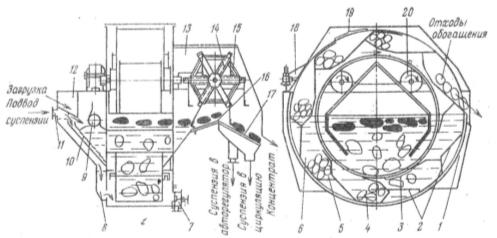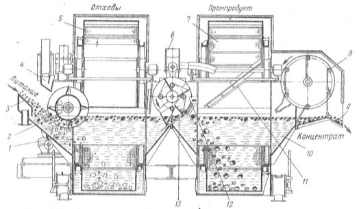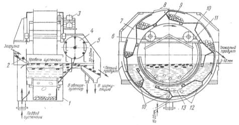Всплывший продукт вместе с потоком суспензии самотеком через отверстие в задней торцовой стенке барабана выгружается в желоб 11. Потонувшая фракция поднимается лопастями 2 вверх, а затем под действием сил тяжести направляется в желоб 12 и далее – на отмывку суспензии. Поскольку лопасти перфорированы отверстиями, в желоб 12 попадает незначительная часть суспензии.