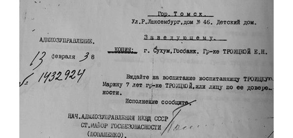 Приказ госбезопасности об освобождении Марины Троицкой из детдома 13.2.1938 г.