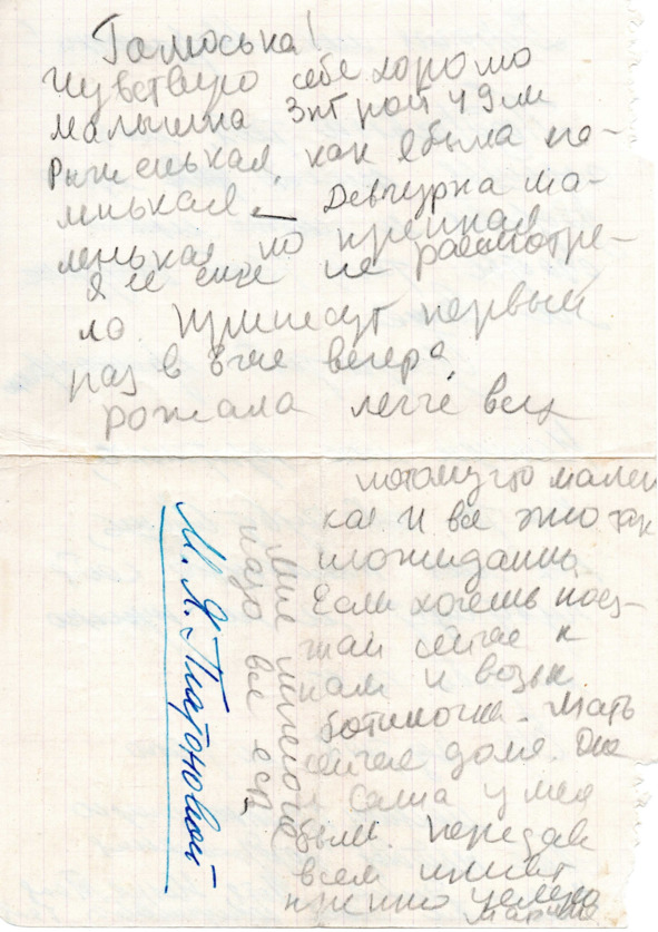 «Галюська! Все хорошо. И я и дочурка. Мне ничего не надо. Чувствую себя хорошо. Окна очень высокие и заглянуть трудно, лучше не лазай. От мамы пришла телеграмма. Оленька курносая, губки бантиком, щечки пухленькие. Выйду 11го. Сейчас пришла врач. Целую Марина».