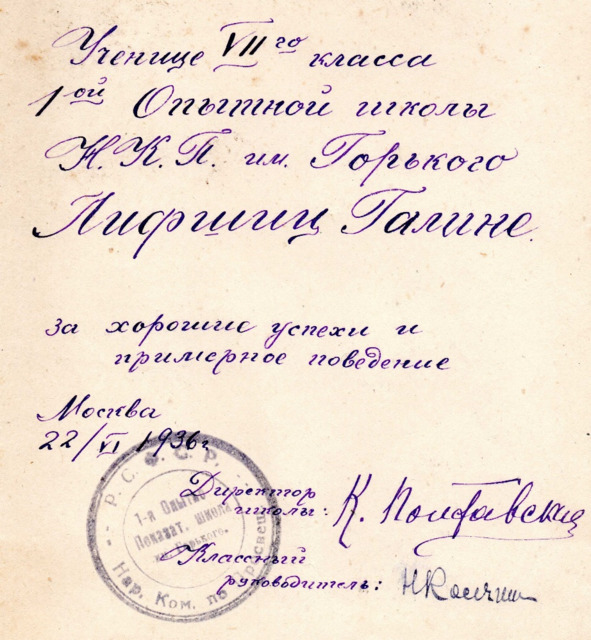 С 1935 г. семья жила в Москве. Галя училась в 1-ой Опытной школе, занималась в историческом кружке11. Осенью 1936 г. отец был арестован, Галю исключили из комсомола. Об этом событии вспоминает в «Подстрочнике» Лилианна Лунгина, учившаяся в той же школе: «В седьмом классе я попала в школу, которую потом и кончила. Это была в моей жизни двенадцатая школа. Самая главная и любимая. Называлась она очень торжественно: «Первая опытно-показательная школа Наркомпроса». Есть роман12, написанный Любой Кабо, там рассказана история нашей школы. Возглавляла ее совершенно замечательная женщина, педагог старой закалки, старого типа, Клавдия Васильевна Полтавская. Она работала еще со знаменитым русским педагогом Шацким.