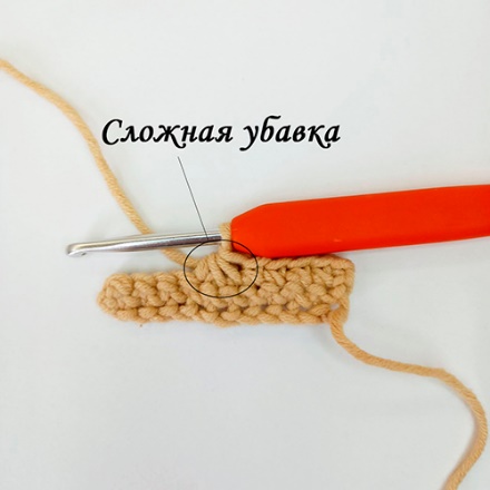 Сложные убавки (на примере тройной убавки) вяжутся следующим образом (на примере вязания СБН):