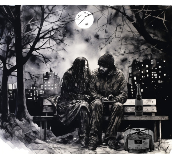 В канун Рождества парочка бомжей, шестидесятилетний Паша и неопределённого возраста Ляля, наткнулись на улице на приятный сюрприз – торт и бутылку шампанского, оставленные кем-то на скамейке. Букет цветов они даже не заметили, зато стали оглядываться по сторонам, думая, что над ними кто-то прикалывается. Улица была полупуста, редкие прохожие спешили к праздничному столу, и никто не претендовал на их находку.