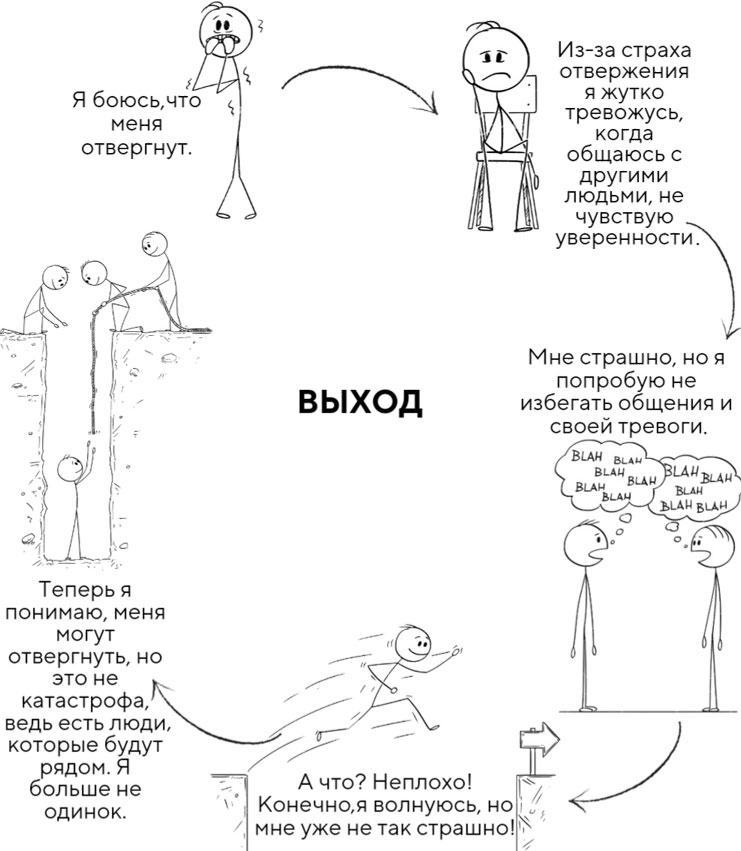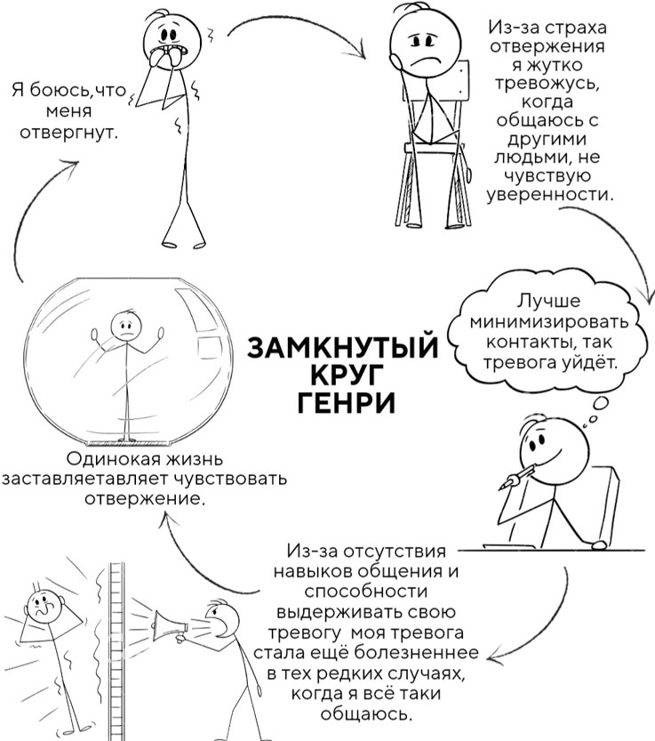 Генри испытывает страх отвержения. Что на самом деле является нормой и встречается практически у каждого человека. Это, кстати, тоже объяснимо с эволюционной точки зрения. В давние времена быть отвергнутым обществом означало неминуемую гибель, в дикой среде человек не мог выжить один, он либо умирал от голода, либо от животных, либо его убивали погодные условия. В любом случае отвержение расценивалось как смертный приговор. Сейчас, конечно, другие времена, но наша психика сохранила этот исторический дар, обеспечивая выживание на протяжении тысячелетий. Так вот, вернёмся к Генри. Из-за страха отвержения он испытывает дискомфортную тревогу, тревогу нежелательную и решает избегать общения, чтобы не испытывать тревогу, т. е. выбирает комфорт. В редких случаях взаимодействия с другими людьми тревога возрастает (из-за отсутствия опыта общения), и, как следствие, жизнь становится одинокой, а тревога более ощутимой, что закономерным образом провоцирует чувство отвержения. Таким образом, Генри привёл себя именно туда, куда так сильно не хотел попасть. Как же найти выход? Давайте снова вернёмся к Генри.